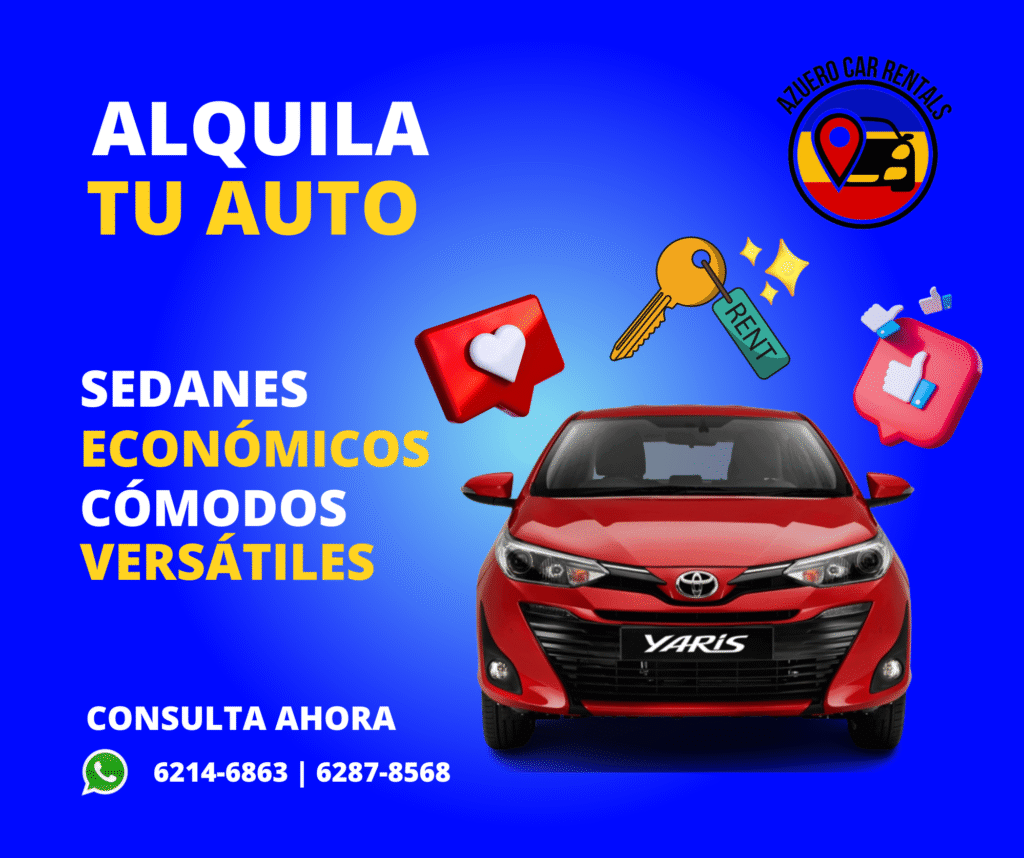 En Azuero Car Rentals, ofrecemos autos económicos y confiables para que descubras la región con total comodidad y seguridad. Nuestra flota cuidadosamente seleccionada garantiza calidad y precios justos, brindándote la mejor experiencia al volante. Pregunta por nuestros autos y sus requisitos.